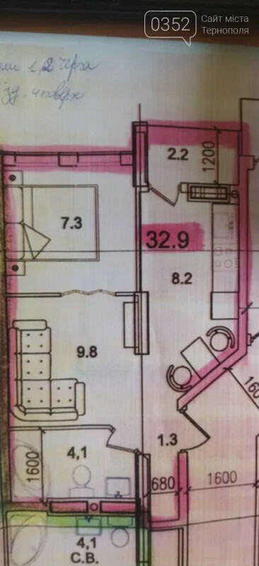 Квартира розташована на 4 поверсі. Загальна площа 32,9 кв.м (вітальня - 17,1 кв.м, кухня - 8,2 кв.м, ванна - 4,1 кв.м, передпокій 1,3 кв.м, лоджія - 2,2 кв.м).