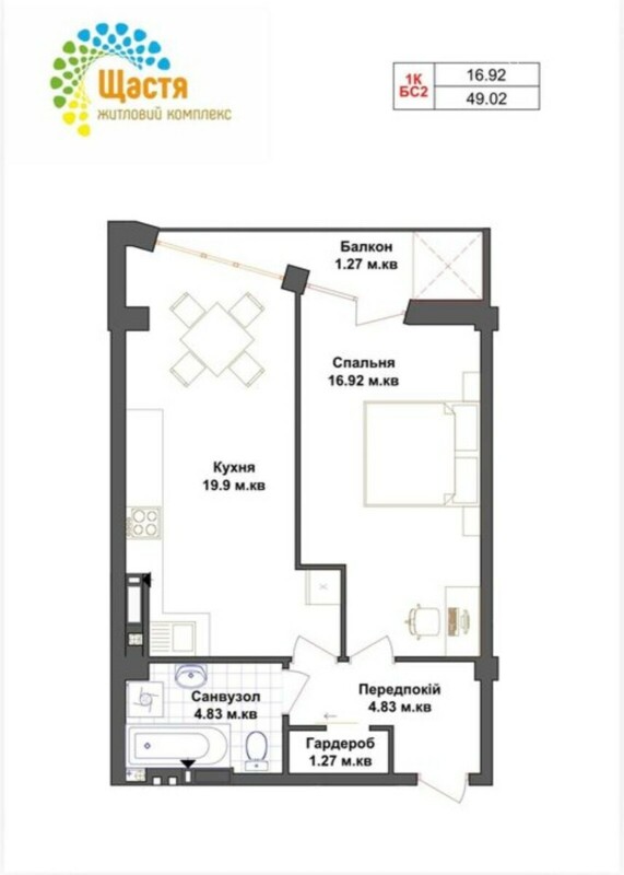 Квартира розміщена на 7 поверсі. Загальна площа 49 кв.м, гарне планування, велика кухня-студія, окрема кімната, сімужний санвузол, місткий передпокій та відкритий балкон.