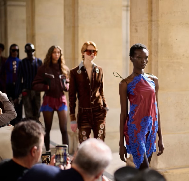 Для жіночого сегмента Камара обрав головною музою Бетті Девіс, другу дружину музиканта та самостійну потужну творчу силу. Образи майстерно поєднують у собі чуттєву структуру та геометричну чіткість, що проявляється в подовжених силуетах і акцентованих плечах. Ти побачиш, як скульптурні талії додають фігурі особливої витонченості, водночас підкреслюючи твою внутрішню енергію. Це потужне мистецтво крою пом’якшується широким використанням мережива, прозорих тканин та драпірованих суконь. Весь одяг рухається плавно разом з кожним твоїм кроком, створюючи ефект живої та динамічної матерії. Колекція також наповнена грайливістю завдяки коротким шортам, глибоким V-подібним вирізам та блиску металевої фурнітури, що відсилає до золотої ери фанку.
